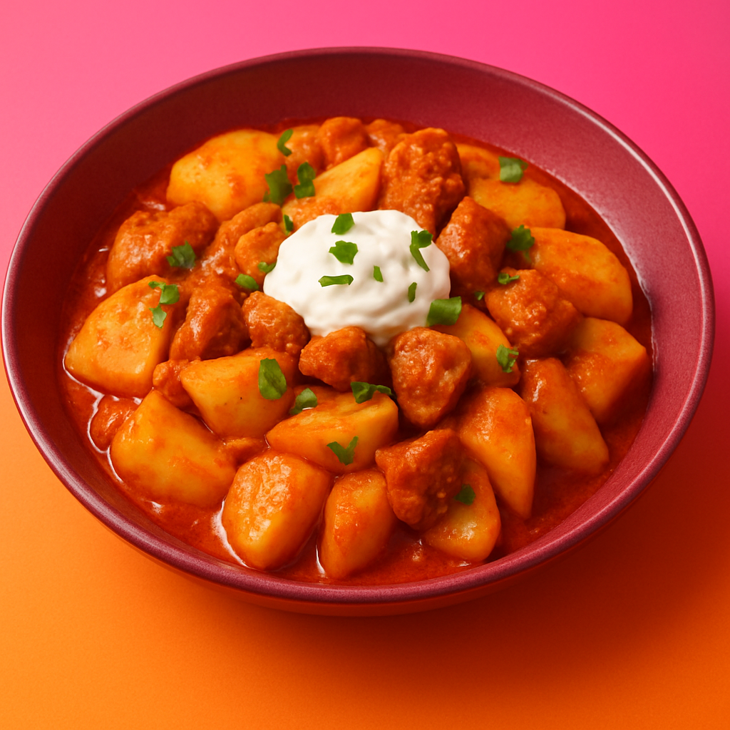 Heat olive oil in a frying pan over medium heat. Add chopped onion and minced garlic, sauté until translucent (~3 min). Add ground beef, cook until browned (~5 min). Mix in tomato paste, paprika, salt, and pepper. Simmer for 5 minutes.