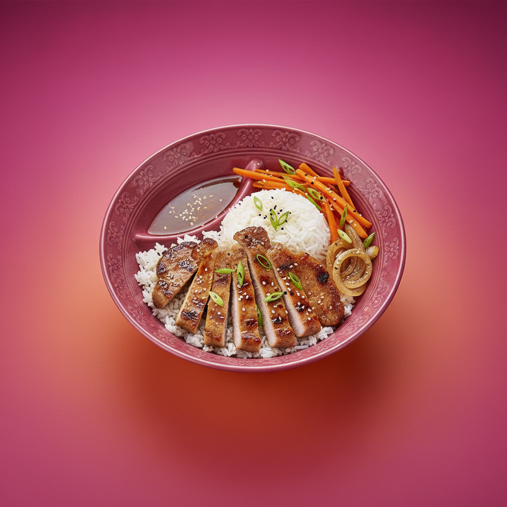 A hearty paleo-friendly breakfast featuring tender pork chops served over fragrant rice, sautéed carrots and onions, infused with Asian flavors for a satisfying morning meal.