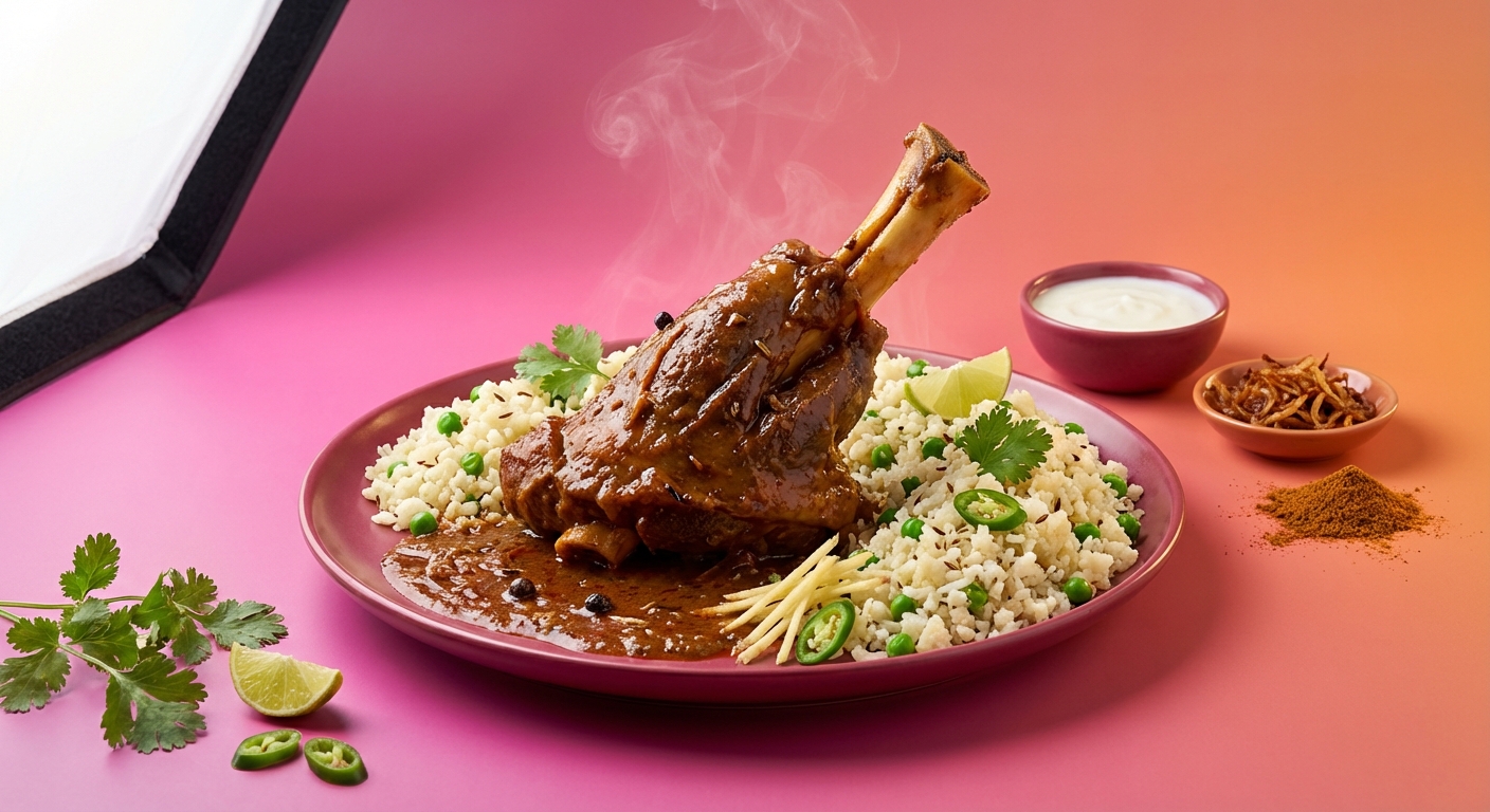 A robust and aromatic slow-cooked beef or lamb stew (Nihari Gosht), traditionally enjoyed for its rich, gelatinous gravy and tender meat, perfectly paired with a light and flavorful spiced cauliflower rice (Gobi Chawal) as a healthier alternative to traditional rice.
