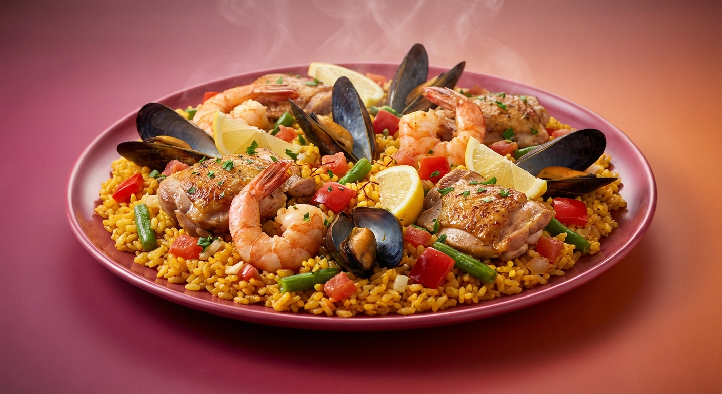 Paella Mixta is a vibrant, flavorful Spanish rice dish combining land and sea. Saffron-infused rice is cooked in a wide, shallow pan with chicken, shrimp, mussels, and vegetables, developing a coveted crispy bottom layer called 'socarrat'. It's a celebratory meal perfect for sharing.