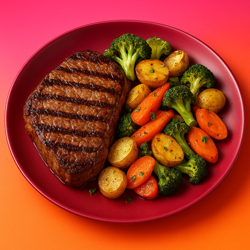 A hearty paleo-friendly American lunch featuring tender grilled beef steak paired with roasted potatoes, onions, and carrots, complemented by fresh herbs for a flavorful, satisfying meal.