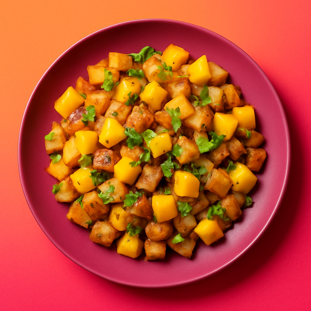A vibrant and energizing breakfast hash combining the sweetness of mango with hearty potatoes, perfect for a quick and wholesome start to your day.